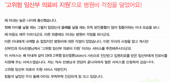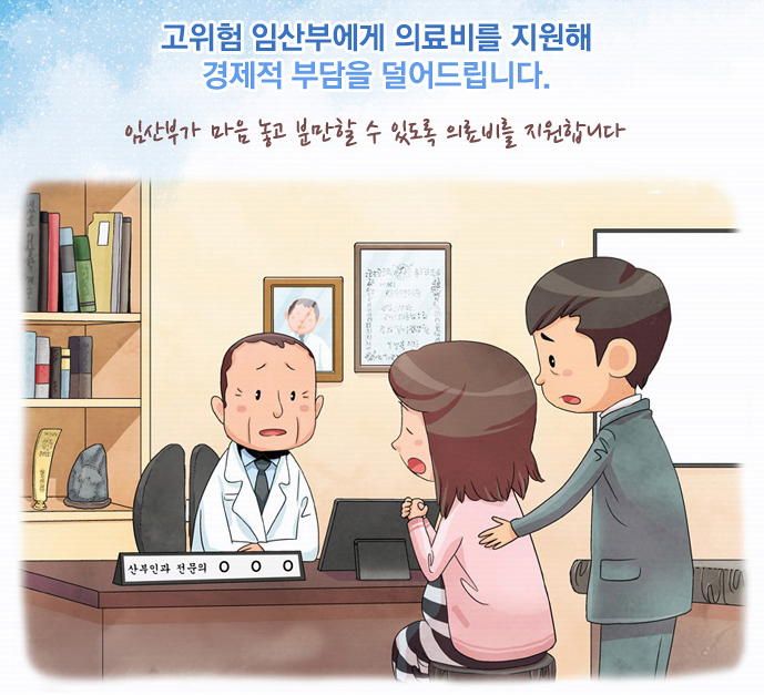 정부에서는 고위험 임신의 치료 및 관리에 필요한 진료비를 지원함으로서, 경제적인 부담을 덜어드릴뿐만 아니라 건강한 출산을 하는데 도움을 드리는 제도를 운영하고 있습니다.