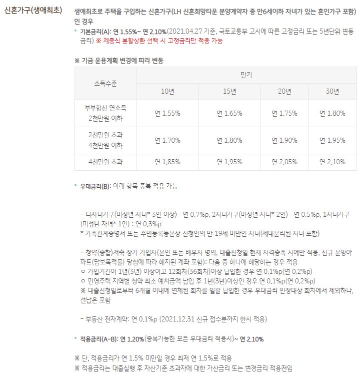 ② 생애최초주택구입자.장애인.다문화.신혼가구 각 연 0.2%(단, 생애최초 주택 구입자 우대금리는 생애전기간 무주택이며, 기금 최초주택구입 대출을 이용한 이력이 없어야만 적용)