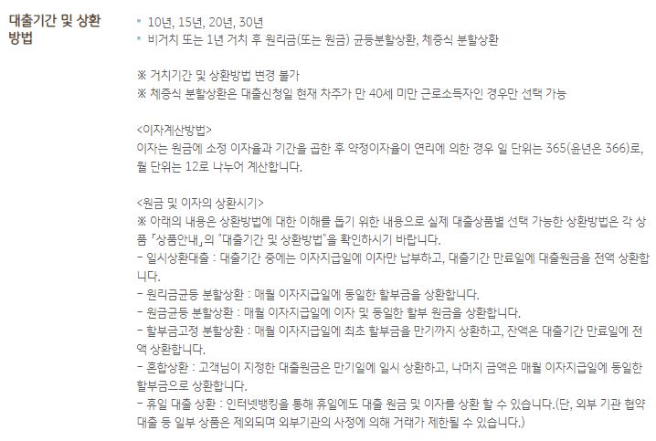 대출기간은 10년, 15년, 20년, 30년 중에서 선택하실 수 있고 비거치 또는 1년거치 후 원리금(또는 원금)균등분할상환, 체증식 분할상환 방식을 선택하실 수 있습니다.