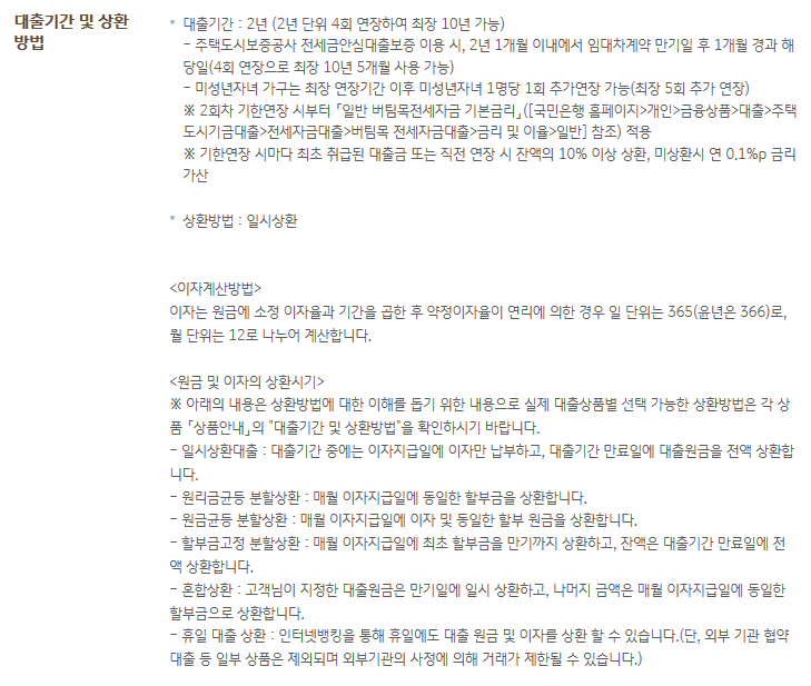 기간은 2년이며, 2년단위 4회 연장이 가능하기 때문에 최장 10년까지 가능합니다. 상환방법은 일시상환이며, 대상주택은 임차 전용면적 85제곱미터 이하, 임차보증금 2억원 이하 주택입니다. (주거용오피스텔포함)