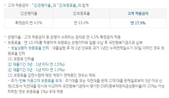 국민은행 햇살론17의 금리는 은행이율과 보증료율을 합하여 산정되는데 은행이율은 확정금리 연 4.5%이며, 보증료율은 연 13.4%로 고객적용금리는 연 17.9%입니다.