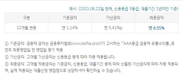 21.6.22일 기준으로 신용등급 3등급, 대출기간 2년미만 기준으로 최저 금리 연 6.55%로 이용하실 수 있는데요.