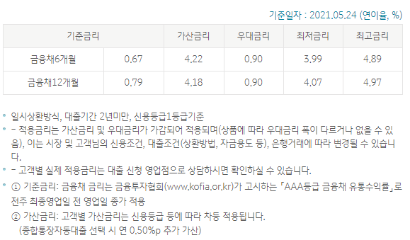 금리는 가산금리 및 우대금리가 가감되어 적용되는데 이 부분은 시장 및 고객의 신용조건, 대출조건, 은행거래에 따라 변경될 수 있는 부분이기 때문에 실제 적용금리는 대출 신청 영업점에서 알아보실 수 있습니다.