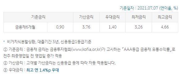 가장 중요한게 바로 금리 부분이라 할 수 있는데요. 21.7.7일 기준으로 최저 3.26%~최고 4.66% 이내의 금리가 나옵니다.