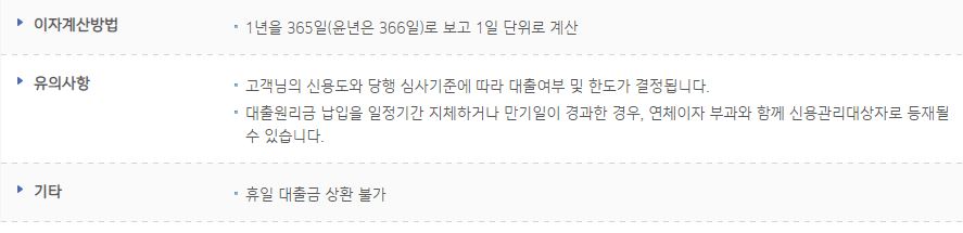 다만, 본인의 신용도나 당행 심사기준에 따라서 대출여부 및 한도가 결정되며, 대출원리금 납입을 일정기간 지체하거나 만기일이 경과할 경우에는 연체이자 부과와 함께 신용관리대상자로 등재될 수 있다는 점 주의하시기 바랍니다.