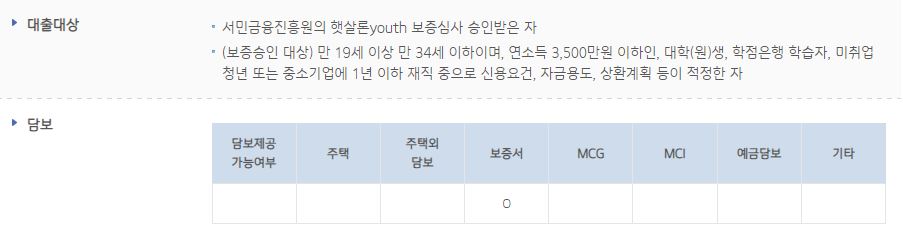 보증승인 대상은 만19세 이상 만34세 이하이며, 연 소득이 3천5백만원 이하인 대학(원)생, 학정은행 학습자, 미취업청년 또는 중소기업에 1년이하 재직중인 분들로서 신용요건과 자금용도, 상환계획 등이 적정한 분들이 대상입니다.
