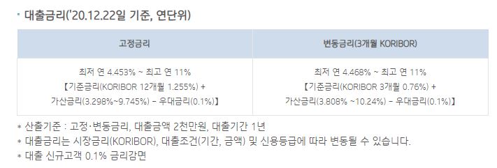 고정금리는 최저 연 4.453%~최고 연 11%이며, 변동금리 (3개월 KORIBOR)는 최저 연 4.468%~최고 연 11%입니다.
