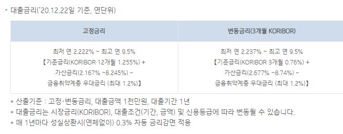 고정금리와 변동금리 모두 최저 연 2.222%~최고 연 9.5%정도로 이용하실 수 있습니다.