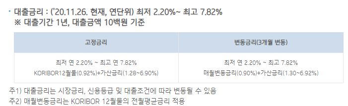 금리는 고정금리와 3개월변동금리가 있는데요. 최저 연 2.20%~최고 연 7.82% 이내에서 적용 받으실 수 있습니다.