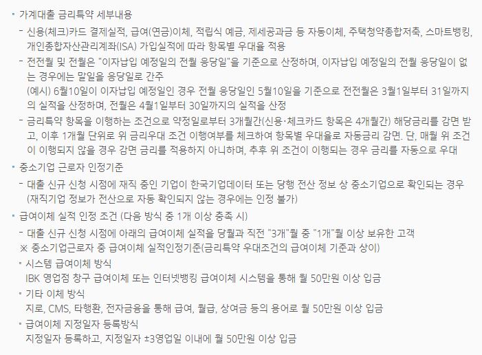 ③ 대출 신규 신청 시 전산 상 중소기업 근로자로 확인되고, 은행에서 정한 당행 급여이체 실적인정 고객은 0.2%금리우대