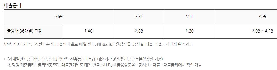 기준금리는 금융채 36개월 고정이며, + 가산금리-우대금리를 통해 최종 금리는 6.9일 기준 2.98%~4.28%로 이용하실 수 있습니다. 다만 본인의 신용등급이나 거래조건 등에 따라서 금리는 차등적용됩니다.