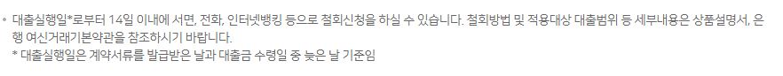 ※ 대출을 신청할 경우 적용된 우대금리는 대출만기까지 적용되고, 기한연기나 금리인하요구 및 조건 변경의 금리 재산출시 우대금리가 변경될 수 있습니다.