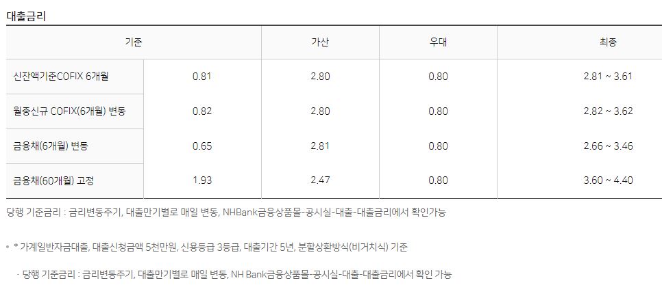 기준금리는 신잔액기준 COFIX 6개월, 월중신규 COFIX(6개월)변동, 금융채(6개월)변동, 금융채(60개월)고정 등 4가지가 있으며, 우대금리는 최대 0.80%까지 제공해드립니다.