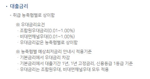 우대금리는 조합원과 비대면채널 우대금리가 각각 0.01%~1.00%의 우대혜택을 제공해드리며, 우대금리 역시 지역별 농축협별로 상이합니다.