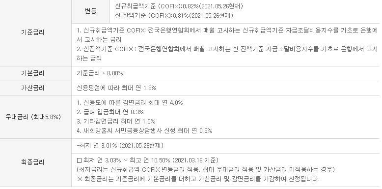최종금리는 21년 5.26 기준으로 최저 연 3.03%~최고 연 10.50% 이내에서 나올 것 같은데요. 이 부분은 개인의 신용도나 소득수준에 따라 달라질 수 있습니다.