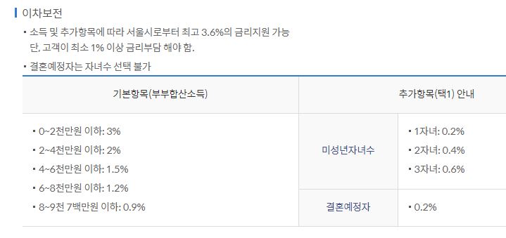 별도의 우대금리는 없으며, 이차보전이라해서 소득이나 추가항목에 따라 서울시로부터 최고 3.6%의 금리지원을 받으실 수 있습니다. 다만 고객이 최소 1%이상 금리를 부담해야 합니다.