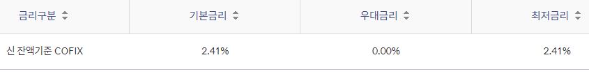 신 잔액기준COFIX: 기본금리 2.41%, 최저금리 2.41%
