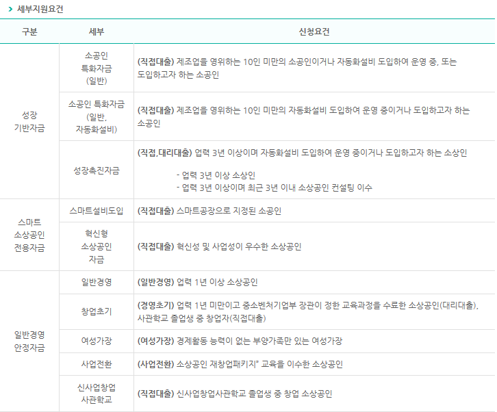 공통지원자격으로 상시근로자 5인 미만업체에 한해서 융자가 이루어지는데요. 제조업이나 건설업, 운수업, 광업은 상시근로자 10인미만업체까지 자격이 주어집니다. 다만 유흥향락업종, 전문업종, 금융업, 보험업, 부동산업 등은 제외됩니다.