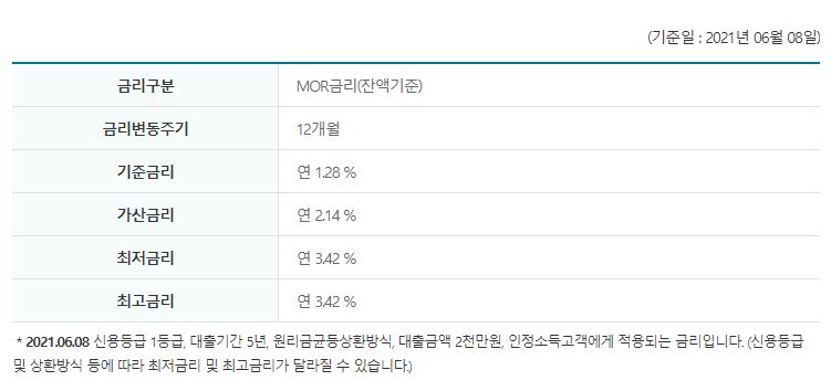 21.6.8일 기준으로 최저 연 3.42%~최고 연 3.42%로 이용을 하실 수 있는데 고객의 신용등급이나 상환방식 등에 따라서 최저 및 최고 금리가 달라질 수 있습니다.
