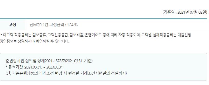 수협 징검다리론 대출금리는 고정금리 신MOR 1년고정금리: 1.24%입니다.(21.7.2기준)