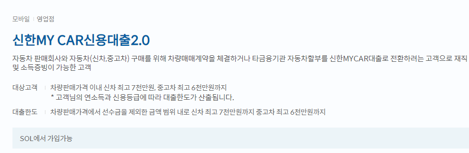 신청은 모바일 신한SOL이나 가까운 영업점에서 가능하오니 신차나 중고차 대출을 알아보시는 분들이나, 기존의 고금리 자동차 대출을 1금융권으로 전환하시고자 하는 분들 중 자격이 되신다면 알아보시기 바랍니다.