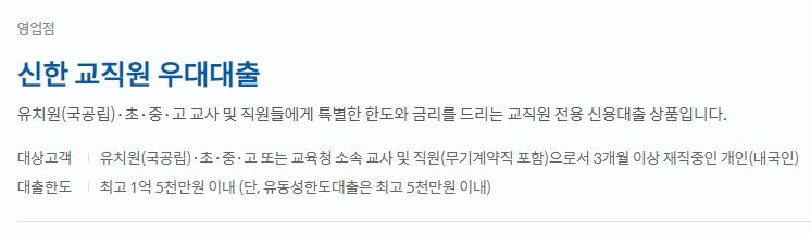 상품이름에서도 알 수 있듯이, 신한은행 교직원 우대대출은 국공립 유치원, 초등학교, 중학교, 고등학교 또는 교육청 소속 교사 및 직원들이 대상이며, 3개월 이상 재직중이신 분들이라면 신청이 가능합니다.