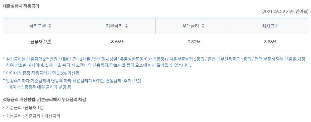 21.6.9 기준으로 최저 3.86%의 금리로 이용을 하실 수 있는데 이는 본인의 신용등급과 담보비율 등의 요건에 따라 달라질 수 있습니다.