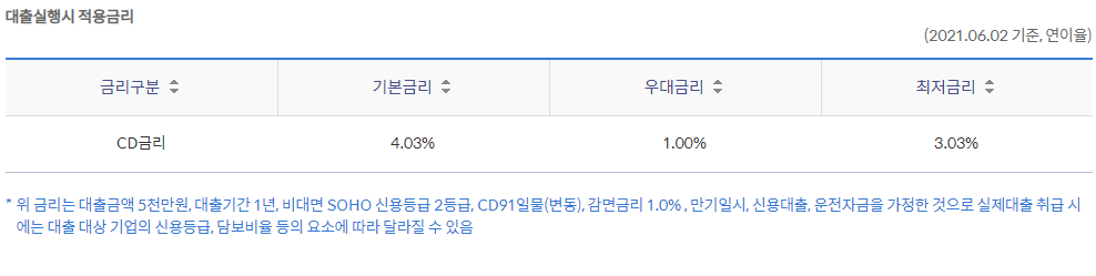 실제 적용금리는 대출대상 기업의 신용등급, 담보비율 등의 요소에 따라 달라질 수 있습니다.