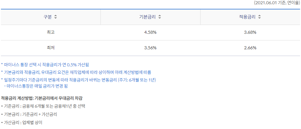 마이너스 통장 선택시 적용금리가 연 0.5% 가산되며, 기본금리와 적용금리, 우대금리 요건은 재직업체에 따라 상이합니다.