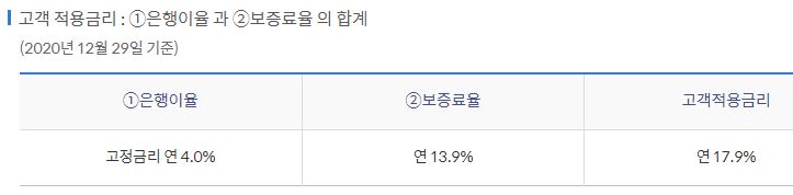 대출금리는 은행이율과 보증료율의 합계인데요. 20.12.29일 기준으로 은행이율은 고정금리 연 4%이며, 보증료율은 연 13.9%로 고객적용금리는 연 17.9%입니다.