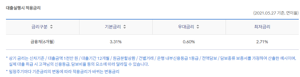 대출금리는 위 표를 참고하시면 되는데요. 정확한 실제 금리는 개인별 신용등급과 담보비율 등의 요소에 따라 달라질 수 있으며, 일정주기마다 기준금리의 변동에 따라 적용금리가 바뀌는 변동금리입니다.
