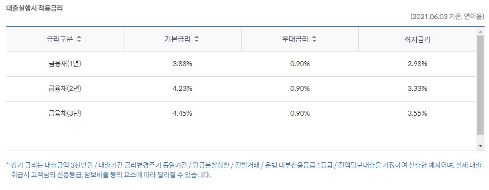 금융채1년: 기본금리 3.88%, 우대금리 0.90%, 최저금리 2.98%