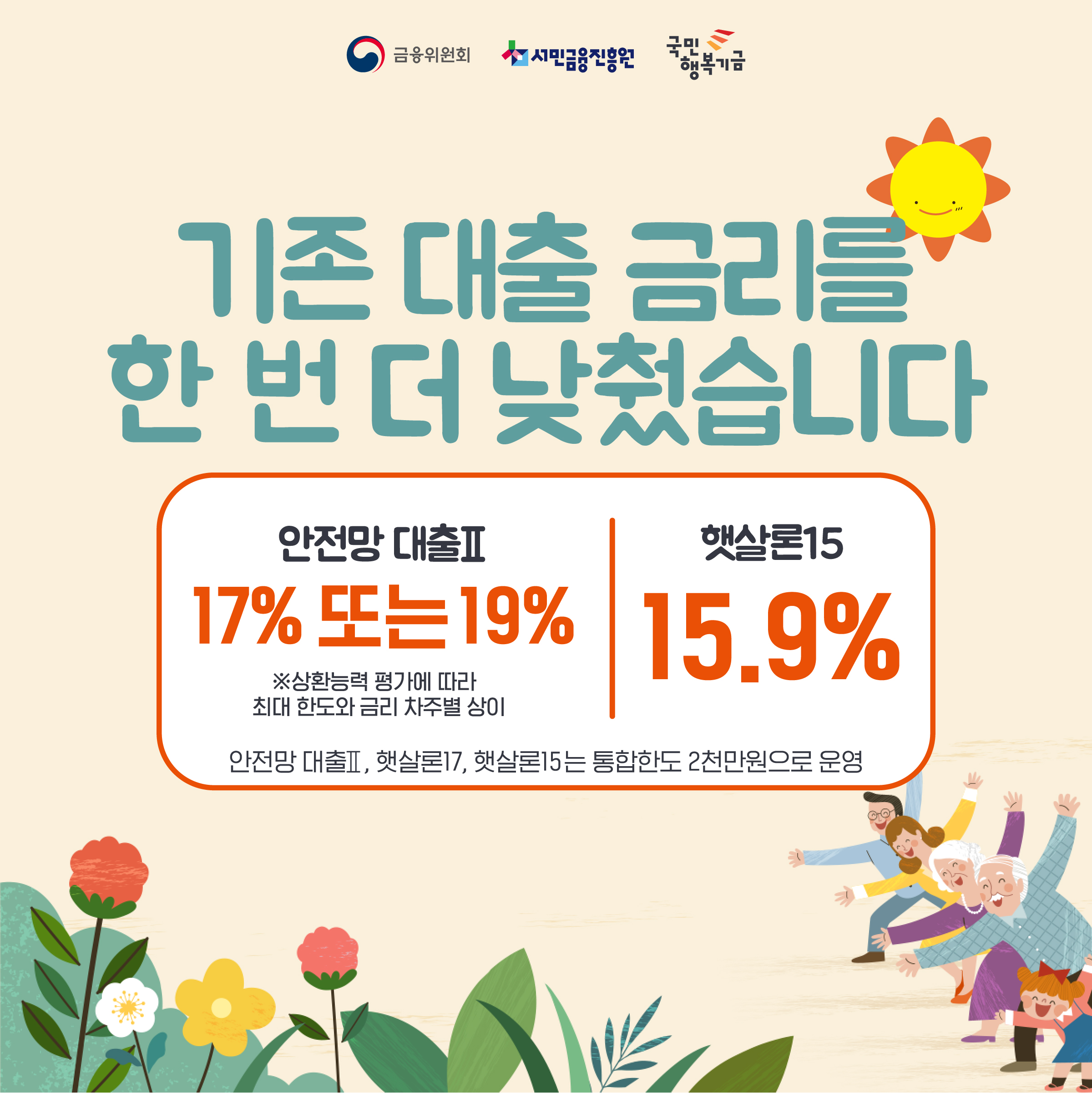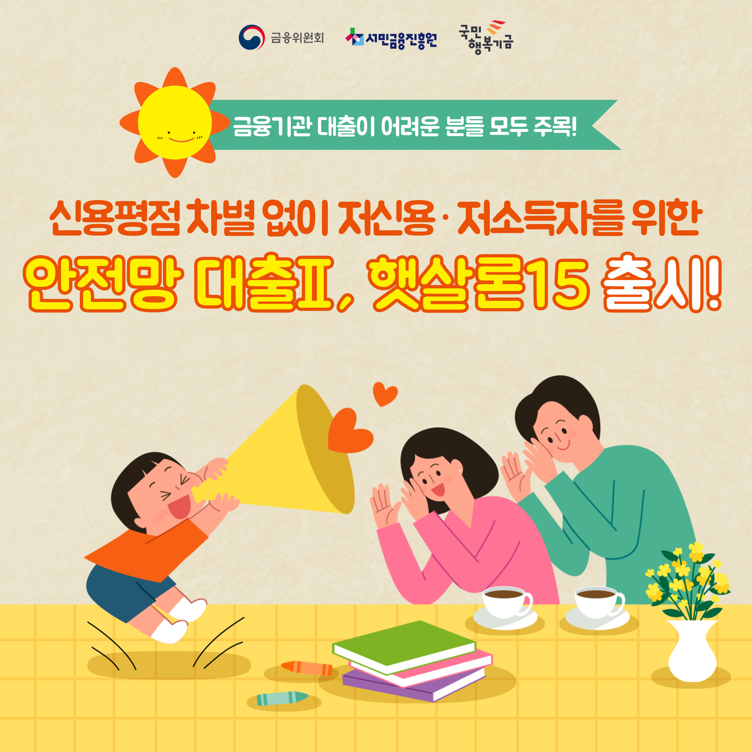 7월달부터는 신용평점 차별없이 저신용.저소득자 분들을 위한 안정망대출Ⅱ, 햇살론 15상품이 출시된다고 해요.