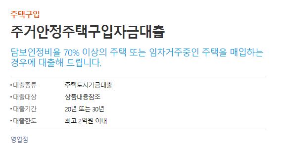 우리은행에서는 담보인정비율 70%이상의 주택이나 임차거주중인 주택을 매입하는 경우에 주택도시기금 대출을 이용해서 주택을 구입하실 수 있는 주거안정주택구입자금대출을 취급하고 있습니다.
