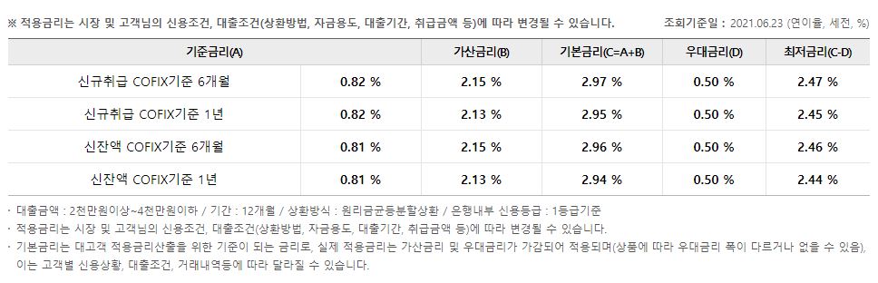 다만 실제 적용금리는 시장 및 고객님의 신용조건과 대출조건 등에 따라서 달라질 수 있다는 점 감안하셔서 알아보시기 바랍니다.