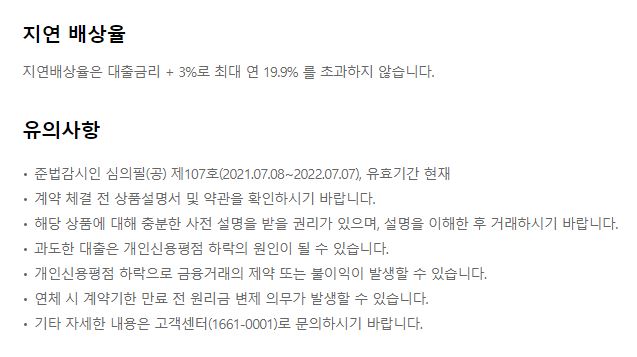 중도상환수수료는 최대 3년까지 부과되는데 2.0%이내에서 수수료가 발생하며, 연체금리는 대출금리에 + 3%이내의 금리가 추가되며, 최대 연 19.9%이내입니다.