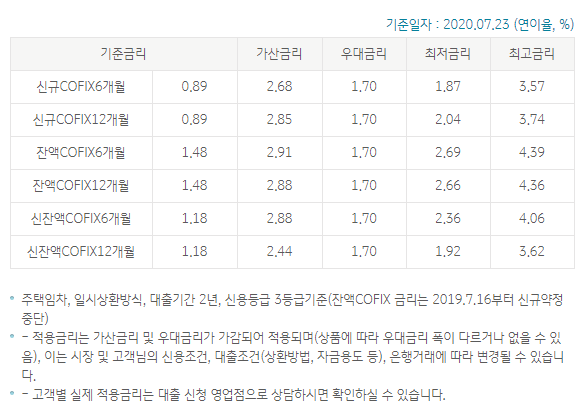 기준금리: COFIX는 대출실행일 직전 영업일 전국은행연합회에 최종 고시되 있는 신규취급액기준 COFIX 또는 신잔액기준 COFIX 중 고객이 약정을 하실때 선택한 금리를 적용합니다.