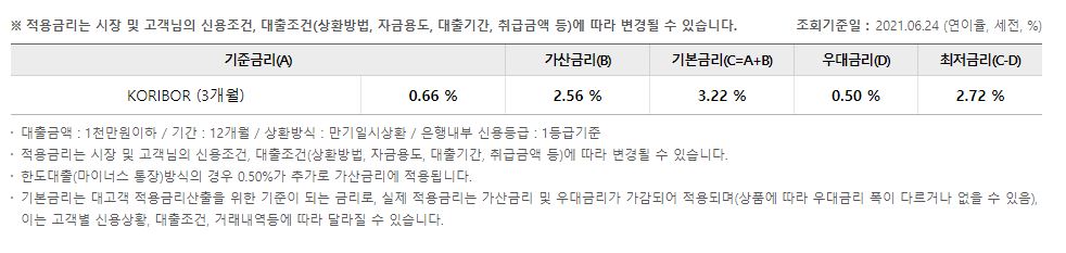 대출금리는 21.6.24기준 최저 2.72%라는 저금리로 이용을 하실 수 있습니다. 다만 고객별 신용상황이나 대출조건, 거래내역 등에 따라서 적용금리가 달라질 수 있다는 점 감안해서 살펴보시기 바랍니다.