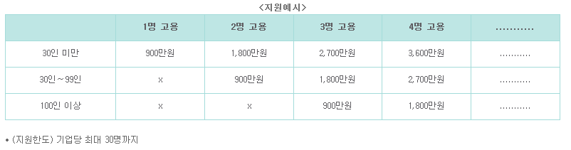 청년 추가채용 1명당 연간 최대 9백만원을 3년동안 지원받을 수 있지만, 기업 규모별 지원인원을 차등화 하고 있습니다.(30인미만 기업인 1번째 채용청년, 30~99인 기업은 2번째 채용청년, 100인 이상은 3번째 채용 청년부터 지원)