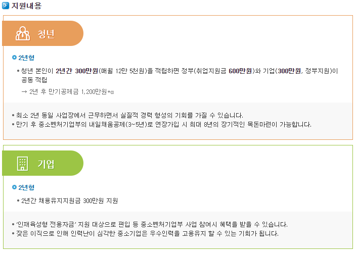 최소 2년간 동일 사업장에서 근무하면서 실질적인 경력 형성의 기회를 잡으실 수 있고, 만기 이후에는 중소벤처기업부의 내일채움공제(3~5년)로 연장가입을 하게 될 경우 최대 8년의 장기적인 목돈마련이 가능하답니다.