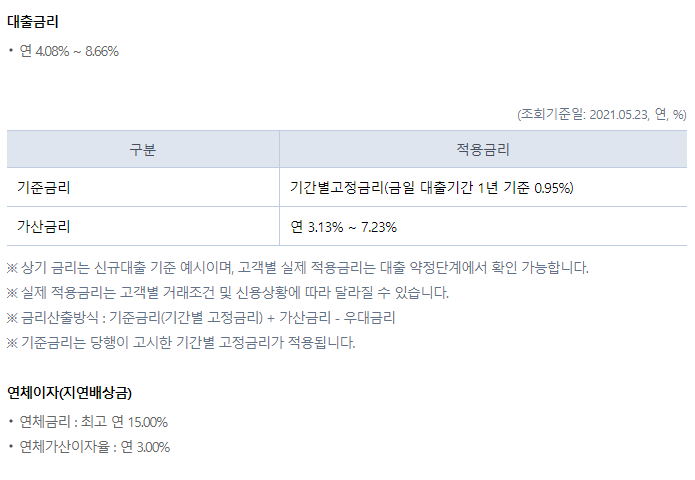 금리는 연 4.08%~8.66% 내에서 받으실 수 있는데요. 기준금리는 기간별고정금리(금일 대출기간 1년 기준 0.95%)가 적용되며, 가산금리는 연 3.13%~7.23%입니다. (21.5.23기준)
