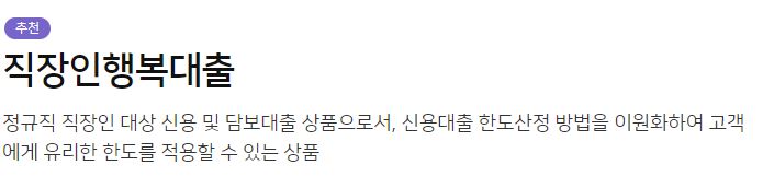 이 상품은 정규직 직장인 분들을 대상으로 신용 및 담보대출을 진행해드리는 상품으로 신용대출 한도산정 방법을 이원화하여 고객에게 유리한 한도를 제공해드립니다.