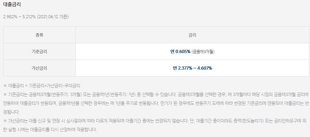 21.6.12일 기준으로 기준금리(금융채3개월)은 연 0.605%, 가산금리는 연 2.377%~4.607%입니다.