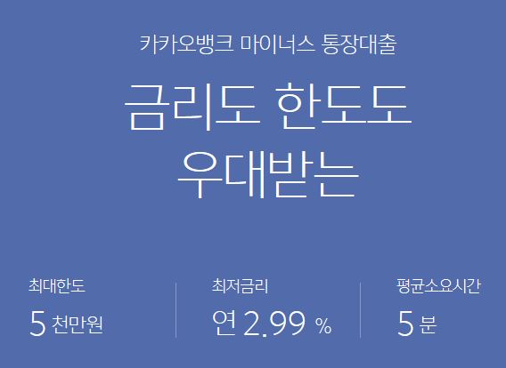카카오뱅크 마이너스통장 대출은 최저 연 2.99%의 저금리로 이용이 가능하지만, 신청자 본인의 신용등급이나 소득, 대출조건, 기간에 따라 달라질 수 있습니다.