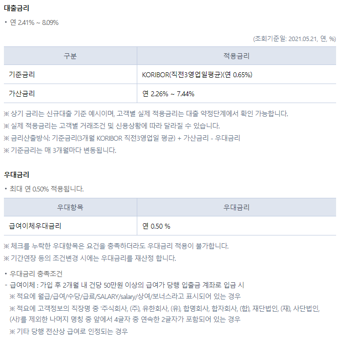 21.5.21기준으로 기준금리는 KORIBOR(직전3영업일평균)연 0.65%이며, 가산금리는 연 2.26%~7.44%입니다.