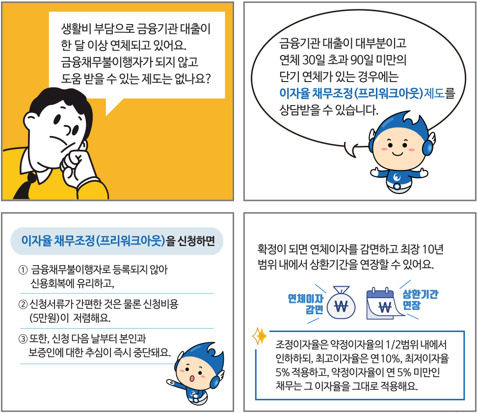 프리워크아웃 제도는 30일초과~90일 미만의 단기연체중인 분들을 대상으로 신속한 채무조정을 통하여 연체 장기화를 방지하는 제도입니다.