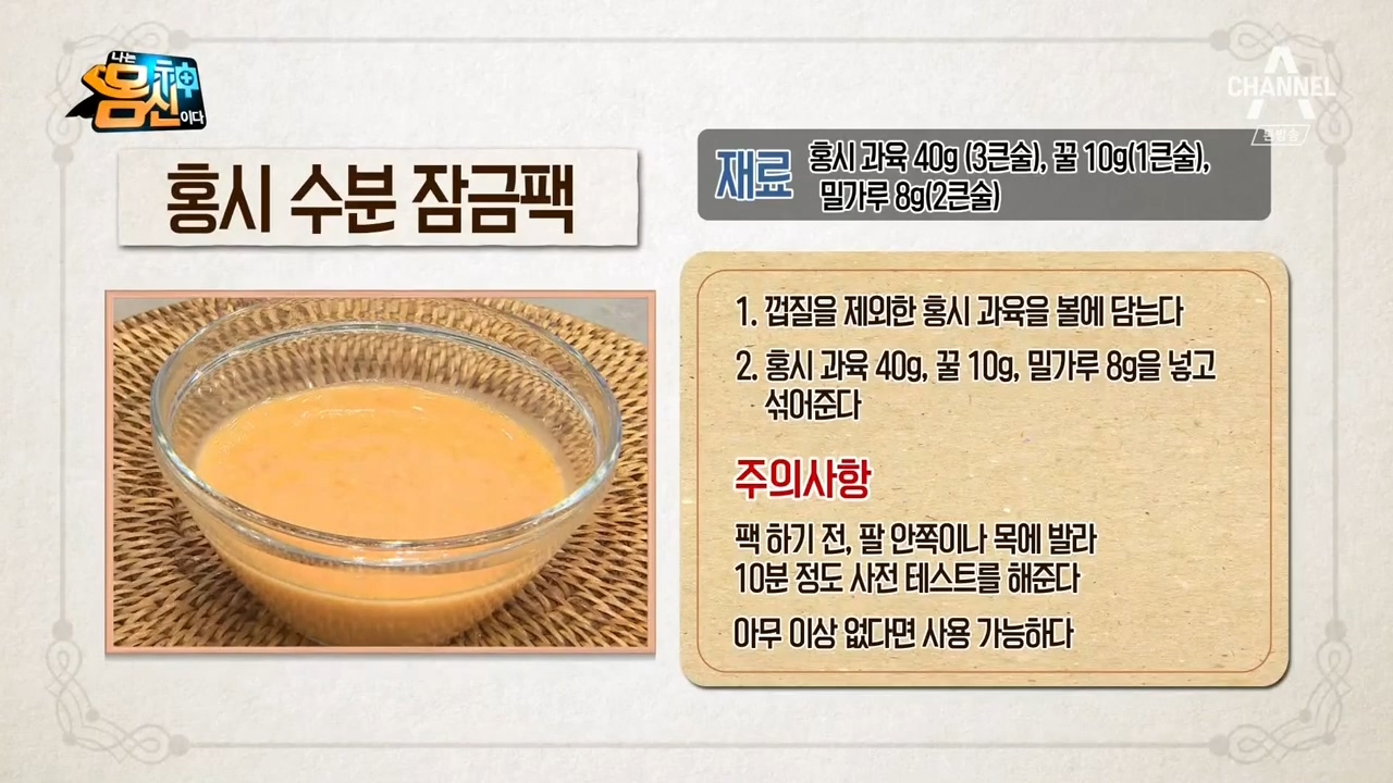 두번째로는 홍시입니다. 홍시에는 비타민이나 미네랄 등이 풍부하게 함유되어 있기 때문에 피부를 촉촉하게 만들어주는 효과가 있으며, 피부를 탄력있고 강하게 만들어주는 베타카로틴이 풍부하고, 탄닌 성분이 피부 조직을 조여주는 역할을 하기 때문에 모공이 넓은 피부에도 효과적이라고 해요