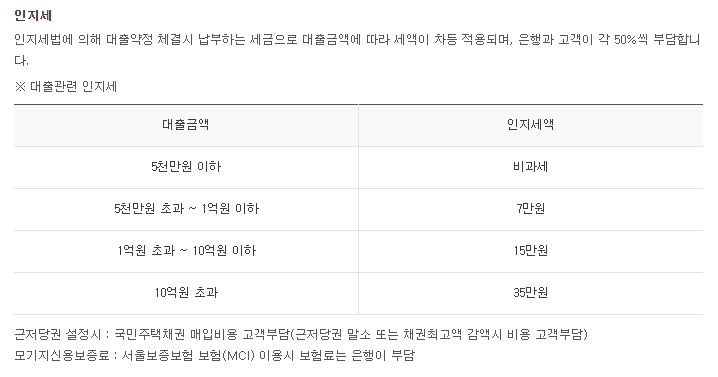 인지세법에 의해서 대출약정을 체결 시 납부하는 세금으로 대출금액에 따라 세액이 차등적용되며, 은행과 고객이 각각 50%씩 부담합니다.