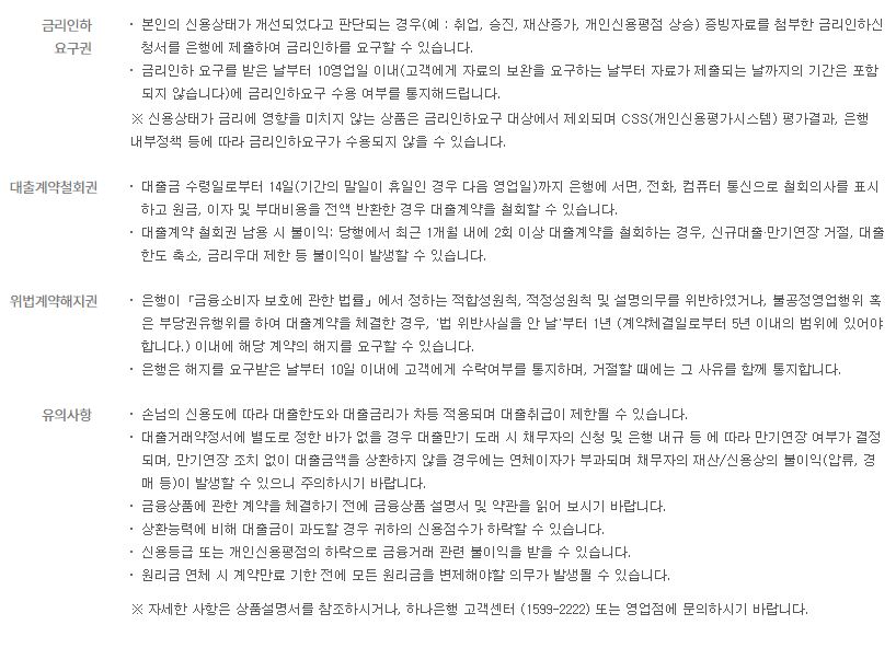 대출금리는 기본금리와 신용등급, 거래조건 등에 따라서 가산되거나 감면되어 결정되기 때문에 실제 적용금리는 하나은행 콜센터 및 영업점에 문의하시면 되는데요.