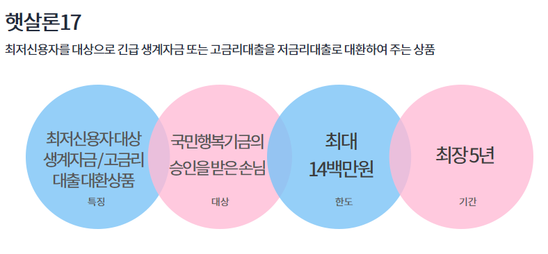 결과적으로 하나은행 햇살론17은 최저신용자대상 생계자금/고금리대출대환상품으로서 국민행복기금의 승인을 받은 분들을 대상으로 최대 1천4백만원까지 대출을 제공해드리는 상품입니다.